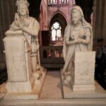 On s’arrête ensuite devant le cénotaphe de Clovis qui est du XIIéme siècle et de celui de son fils Childebert. L’oriflamme qui est exposé date de 1914. Saint-Denis était chargé de la conservation de cet objet qui précédait les troupes royales. Saint-Denis était aussi chargé de la conservation des régalias qui étaient les objets indispensables lors du sacre du roi. En dehors de la couronne c’était le sceptre, la main de justice, l’épée, l’éperon, le grand manteau et la sainte ampoule. A côté se trouvent les statues commémoratives de Louis XVI et de Marie-Antoinette réalisées en 1815 à la demande de Louis XVIII.