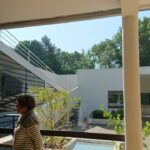 Sous la conduite d’uns conférencière, nous sommes entrés par l’arrière dans le vestibule qui est pourvu d’un lavabo surprenant mais intégrant ainsi les principes hygiéniste de l’architecte. A ce niveau on trouve les deux chambres de domestiques, le studio du chauffeur, la buanderie-lingerie et le garage. Celui-ci pouvait accueillir trois voitures. L’accès à l’étage se fait par une rampe qui permet de profiter des points de vue sur les volumes,des jeux de lumières et de la nature et par un escalier hélicoïdal destiné aux domestiques.