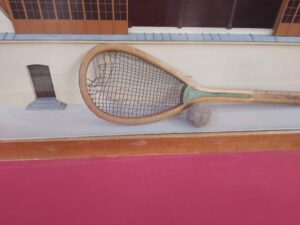 La salle du jeu de Paume a été construite en 1694 pour le le roi Louis XIV et a été récemment restaurée. C’est une longue salle avec une galerie pour les spectateurs protégée par des filets car la balle était lourde et pouvait blesser. Les règles du jeu étaient très élaborées : un seul rebond, on peut jour avec les murs….Au départ on jouait avec la paume, puis avec des gants, puis avec un battoir et enfin avec une raquette.
